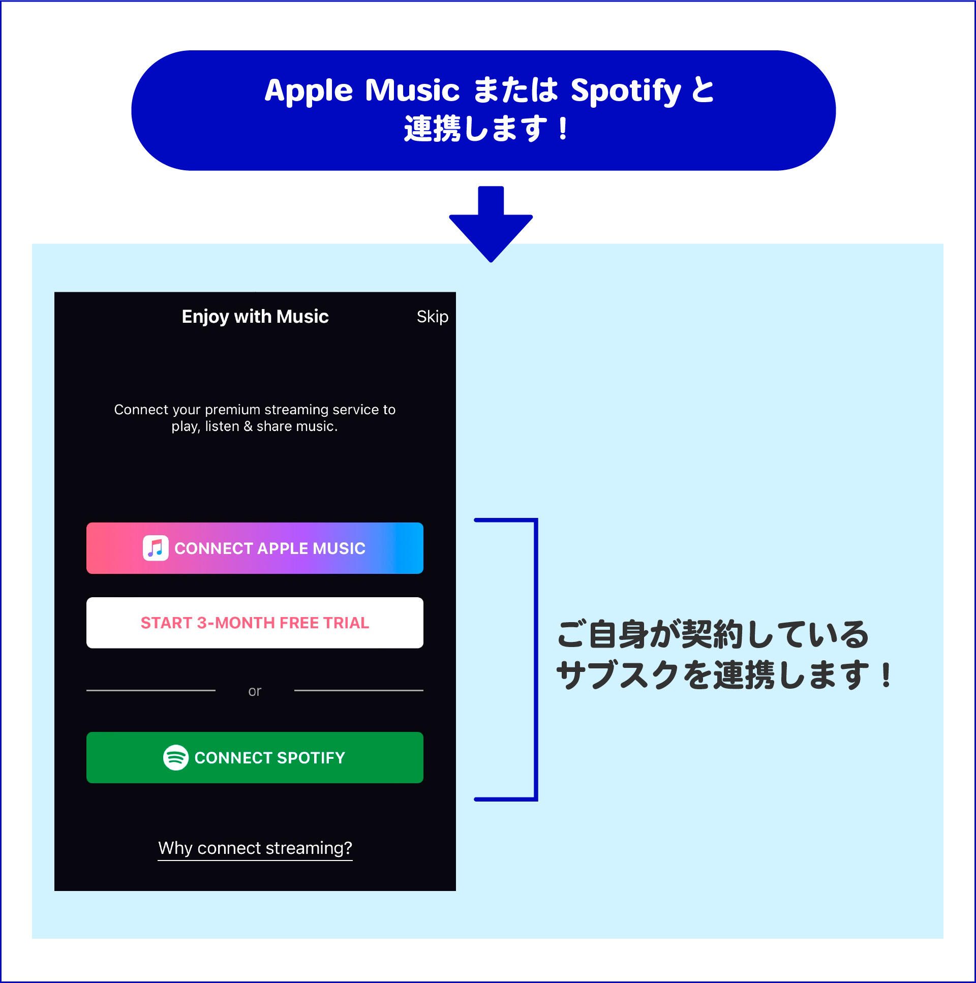 Apple music または Spotifyと連携します