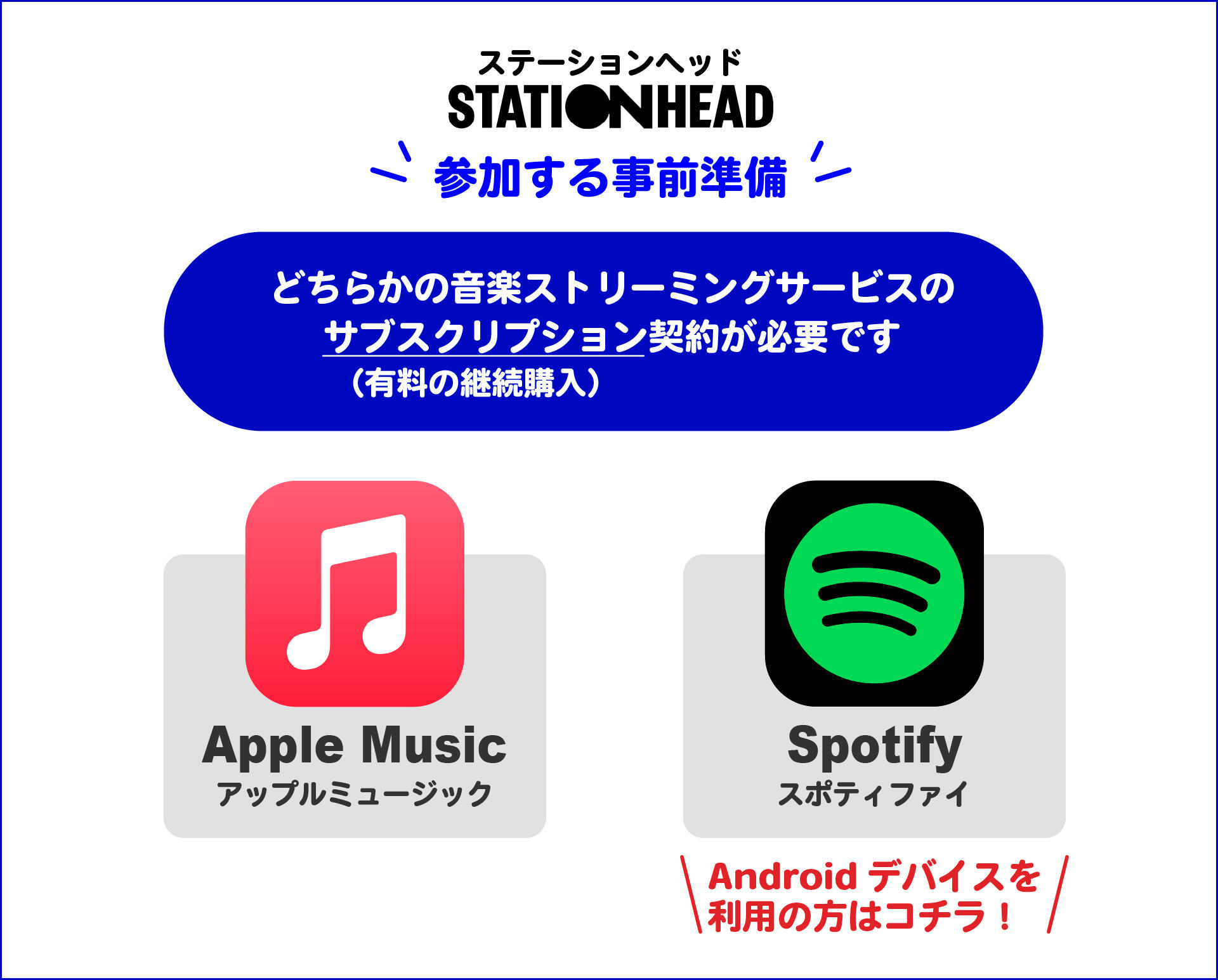 Stationheadへのログイン時に、必ず上記2つどちらかの有料会員アカウント(サブスク登録済)と連携する必要があります
